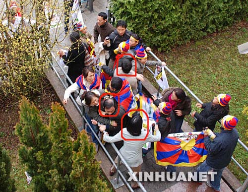 3月17日,“藏獨”分子暴力沖擊中國駐德國慕尼黑總領館,用瓶罐、樹棍等粗暴圍攻領館工作人員(紅圈標注為領館工作人員)。