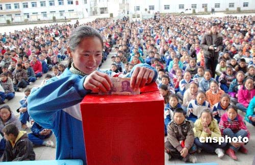 拉薩市堆龍德慶縣中學的1825名師生3月23日向“3·14”事件受害民眾捐款,同學們拿出平時節(jié)省的零花錢踴躍獻愛心。3月14日拉薩市發(fā)生打、砸、搶、燒事件后,拉薩市各企事業(yè)單位、民間組織等社會各界紛紛譴責達賴集團的罪惡行徑,紛紛捐款捐物關懷受害無辜民眾。中新社發(fā) 周波 攝
