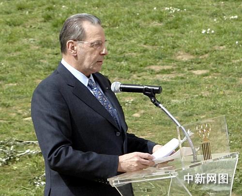 希臘當(dāng)?shù)貢r(shí)間3月24日,北京二00八年奧運(yùn)會(huì)圣火采集儀式在古奧林匹亞競(jìng)技場(chǎng)舉行。國(guó)際奧委會(huì)主席羅格致辭。中新社記者 王歡