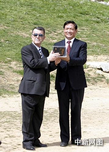 希臘當(dāng)?shù)貢r(shí)間3月24日,北京二00八年奧運(yùn)會(huì)圣火采集儀式在古奧林匹亞競(jìng)技場(chǎng)舉行。北京奧組委主席劉淇接受希臘奧委會(huì)主席的贈(zèng)禮。 中新社記者 王歡