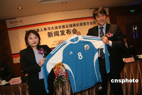 3月25日,在中超2008賽季開賽的前4天,大連實德足球俱樂部舉行新聞發布會。總經理李明及主教練拉德科出席并正式宣告首創安泰人壽成為其官方合作伙伴。發布會上還展示了大連實德的中超2008賽季新隊衣。中新社發 大新 攝