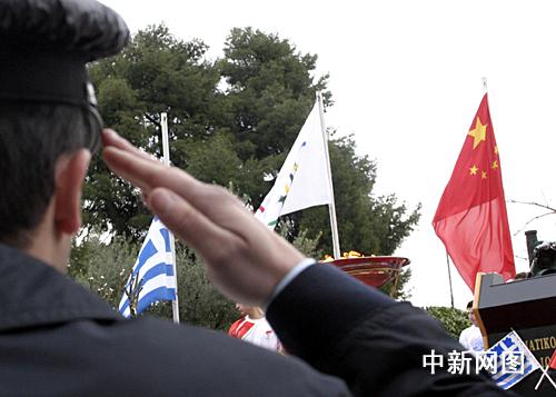 3月25日,北京2008年奧運圣火希臘傳遞第二天,慶典儀式在終點約阿尼納舉行。儀式上舉行升旗儀式,警察向國旗敬禮。中新社記者 王歡