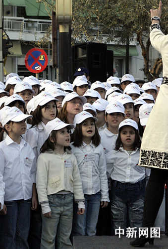 3月26日,北京奧運會圣火希臘境內傳遞第三日,抵達當天最后一個城市韋里亞。當?shù)貎和莩獖W林匹克會歌和希臘國歌。中新社記者 王歡