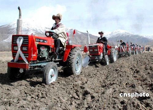 3月26日,拉薩市達孜縣德慶鎮桑珠村的農牧民們穿上節日盛裝,用政府新支援的拖拉機開始春耕生產。藏族農牧民一年一度的春耕并沒有受到拉薩“3.14”打、砸、搶、燒暴力事件的影響。中新社發 周波 攝