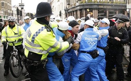 4月6日的圣火傳遞過程中,不斷有人滋事,倫敦警方為此拘捕數(shù)名鬧事者