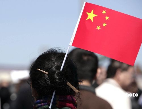 當地時間四月九日,北京奧運圣火在美國舊金山進行傳遞,成千上萬的華人華僑為北京奧運圣火傳遞助威吶喊。一女子將五星紅旗插在發(fā)髻上參加火炬歡迎儀式。 中新社發(fā) 劉丹 攝