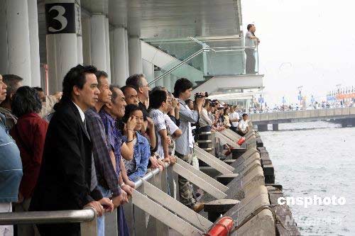香港舉行北京奧運火炬傳遞路線預演,吸引眾多市民游人在岸邊觀看。王麗南 攝
