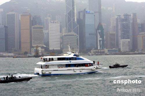 香港舉行北京奧運火炬?zhèn)鬟f路線預(yù)演,維港海上數(shù)艘警用巡邏艇、快艇、護(hù)送火炬?zhèn)鬟f游輪過海,消防船在維港射水致意、飛機(jī)空中盤旋護(hù)駕。 王麗南 攝