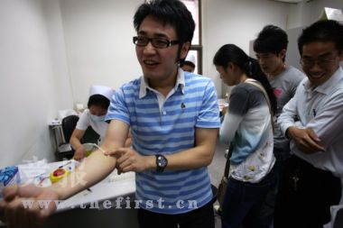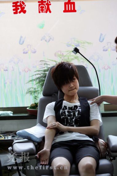 何潔、黃雅莉是約好一起開車到血液中心的,并在車上填完獻血申請表。看到血液中心竟然有這么多人在獻血,她們也很激動,“不知道這么多人都會來啊,都是為災區,感覺很感動!焙螡嵳f:“我以前在四川上學,已經問候了那邊的朋友,他們都很平安。今天是我第一次獻血,感覺還好吧。”同來的黃雅莉雖然緊張,但還是很期待:“哎,不就是抽點血嘛,抽完了就好啦!痹诼犝f好朋友李宇春也來獻血時,她們很關心:“春春暈血,她現在沒事吧!辈贿^在進入驗血室時,剛剛還一副豁出去樣子的黃雅莉卻像孩子一樣跟公司的工作人員說:“其實我還是有點緊張哈!”但是她在何潔抽血時,卻不停地給同伴鼓勵:“何潔,別緊張,我支持你哦!”