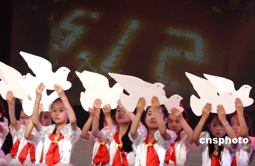 2008年5月19日,河南電視臺都市頻道舉行賑災(zāi)捐款晚會,來自鄭州多所學(xué)校的小學(xué)生手舉“和平鴿”為四川地震災(zāi)區(qū)人民祈福。