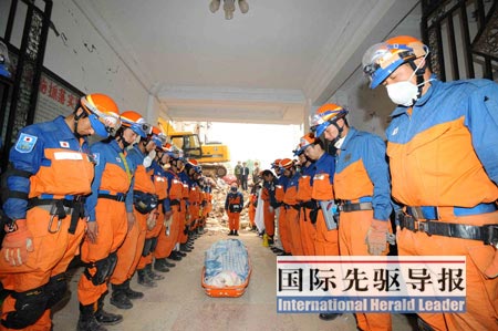這是足以令每個中國人都為之震撼的一幕!5月17日早晨7點30分左右,四川青川縣喬莊鎮一處倒塌的六層樓廢墟旁,31名全副武裝的日本搜救隊員分成兩列,集體向兩名中國遇難者遺體默哀。經過14個小時的努力,他們最終還是沒能挽回這兩條年輕的生命——一名27歲的女性宋雪梅和她剛出生75天的女兒。