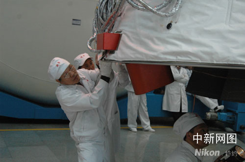 中國神舟七號載人航天飛船發(fā)射在即。圖為飛船推進(jìn)艙測試。
