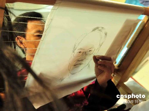 孟永國在記者會上特別創作了一幅特首曾蔭權的發繡畫。