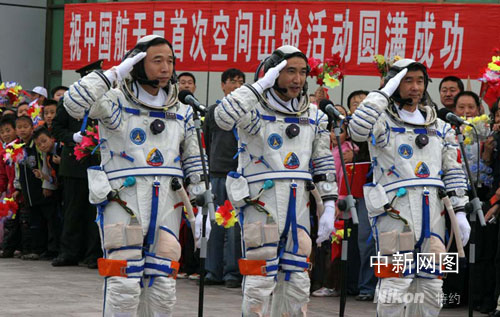北京時間二十五日下午五時三十五分許,“神七”航天員乘組在中國酒泉衛星發射中心航天公寓“問天閣”廣場舉行出征儀式,身穿乳白色艙內航天服的“神七”三名航天員翟志剛、劉伯明、景海鵬受命出征太空。孫自法 攝