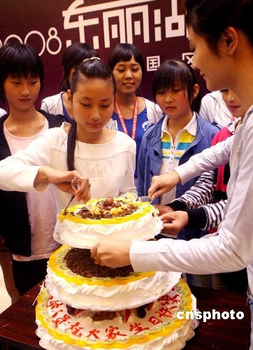 圖為在天津上學的甘肅地震災區學生與參賽佳麗一起慶賀生日。中新社發 錢興強 攝