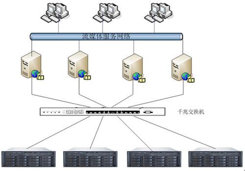 IP SAN 的存儲區域網絡,來提供視頻資料的存儲。視頻服務器的前端通過光纖