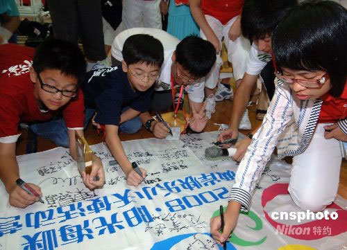圖為臺(tái)北光復(fù)小學(xué)學(xué)生與福建小營(yíng)員們共同在“2008·陽光海峽”兩岸快樂小天使活動(dòng)營(yíng)旗上簽名。