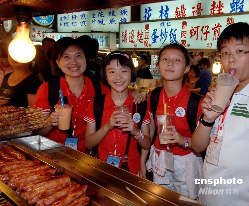 福建小營員夜游臺北“士林夜市”,品嘗當地特色小吃。中新社發 劉可耕 攝