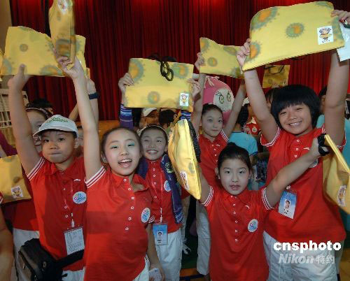 圖為來自福建的小營員們與臺北光復小學學生相互交換禮物。中新社發(fā) 劉可耕 攝