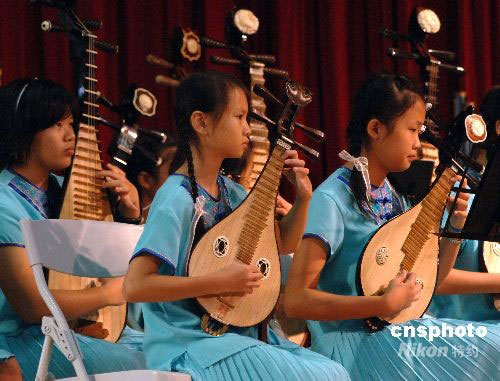 圖為臺北光復小學樂團成員為到訪的福建小營員傾情表演民樂合奏曲目《家》。中新社發 劉可耕 攝