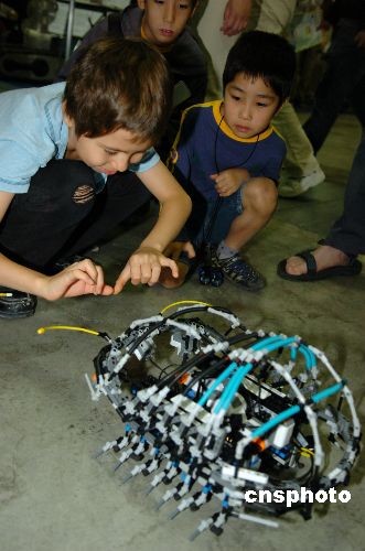 圖為孩子們?cè)诤蜋C(jī)器蟲子進(jìn)行交流。中新社發(fā) 朱沿華 攝