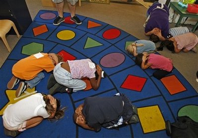 學(xué)生在大規(guī)模地震演習(xí)中。