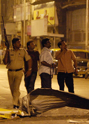 11月27日,警察在印度孟買戈拉巴街區(qū)的恐怖襲擊現(xiàn)場警戒。