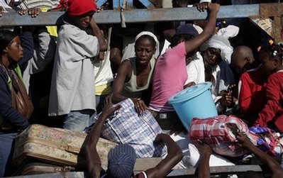 中新網1月19日電 據外電19日報道,數以千記的海地災民爭相擠上開往太子港郊區的公共汽車,希望在那里能夠更容易的找到食物和水。