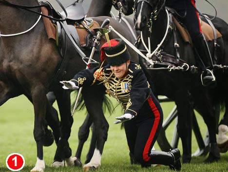 21日當天,英國皇家騎兵團的成員攜禮炮向海德公園進發,一路上不少民眾擠在道路兩旁觀看。忽然一名年輕的女炮手跌身下馬,眾目睽睽之下,她慌忙環視四周并立即翻身上馬,以保證隊列安全行進。英國《每日郵報》的記者眼疾手快,將女炮手摔下馬的情景搶拍了下來。(梁陳聰)