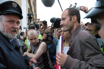 示威民眾8日傍晚在布拉格外交部外面要求警察向正在外交部內享用晚宴的賴斯轉交一封公開信,但被以“安全理由”拒絕。黃頻攝影
