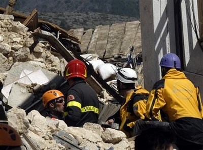 拉奎拉省的平民保護部門官員估計,當?shù)匾延腥种慕ㄖ锏顾。?jù)估計,數(shù)名大學生仍然被埋在一幢大學宿舍的瓦礫下,該處仍有一批救援人員和消防員在泛光燈的照明下進行搜索。