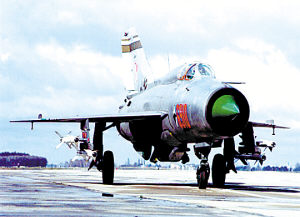 新聞背景 據(jù)美聯(lián)社報道,2008年底,作為冷戰(zhàn)的一個象征,在與蘇聯(lián)的主要對手——北約的對抗前線服役了50年后,米格-21戰(zhàn)機(jī)行將退役。英國專業(yè)刊物《空軍月刊》的編輯阿倫·沃恩斯評論:“在第二次世界大戰(zhàn)之后的歐洲,沒有任何一種飛機(jī)能像米格-21那樣,對軍事航空領(lǐng)域產(chǎn)生那么深遠(yuǎn)的影響”。