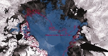 衛(wèi)星圖片顯示今年北極融冰范圍相對去年(紅線范圍)擴大許多。