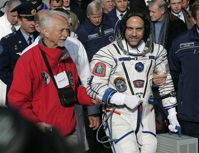 10月12日,美國百萬富翁理查德·加里奧特穿著宇航服來到哈薩克斯坦境內的拜科努爾航天中心。
