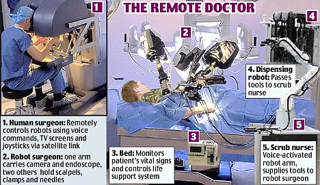 為了挽救更多士兵的生命,五角大樓已經(jīng)投資875萬(wàn)英鎊,與美國(guó)加州斯坦福研究院下屬的高科技公司簽訂制造多功能機(jī)器人的合約,包括名為“療傷機(jī)”的機(jī)器人醫(yī)生。這種機(jī)器人有三條手臂,一條用來(lái)控制內(nèi)診鏡,讓人類(lèi)醫(yī)生可以看到傷者身體內(nèi)部情況,另外兩條手臂則拿著外科手術(shù)工具。此外,還有一種“擦洗護(hù)士”機(jī)器人,負(fù)責(zé)為機(jī)器人醫(yī)生傳遞各種工具。這些機(jī)器人也能與病人交談,安慰他們,以及問(wèn)他們一些問(wèn)題。