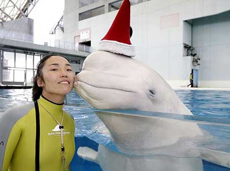 中新網(wǎng)12月19日 綜合媒體報(bào)道,由于圣誕節(jié)將至,日本橫濱八景島海洋樂(lè)園為了吸引更多的游客前來(lái)游覽亮出奇招,給館內(nèi)的兩頭白鯨戴上可愛的圣誕帽,前來(lái)游覽的游客甚至有機(jī)會(huì)得到這兩頭戴著圣誕帽的白鯨的親吻。