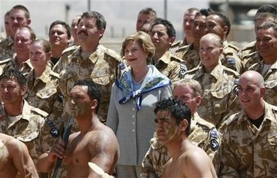 中新網6月0日電 美國第一夫人勞拉-布什8日突然造訪阿富汗慰問駐軍,勞拉這次前往新西蘭負責的重建區域,新西蘭士兵還大跳毛利人的戰舞歡迎勞拉。與布什看舞蹈會跟著擺動身軀相比,勞拉相對之下就冷靜得多。