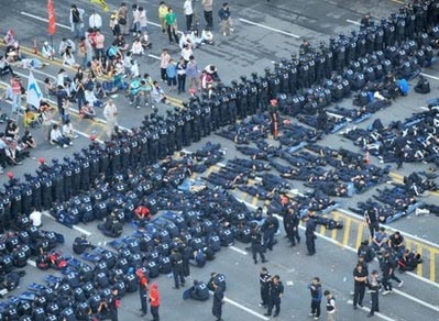 25日晚,由3千多人組成的示威隊(duì)在首爾德壽宮大漢門前廣場(chǎng)舉行“反對(duì)強(qiáng)行刊登告示”燭光集會(huì),并向青瓦臺(tái)方向挺進(jìn),他們?cè)谝恍┞范闻c警方對(duì)峙到26日凌晨,同時(shí)發(fā)生了多起示威隊(duì)與警方?jīng)_突的事件。