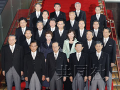 日本首相福田康夫(前排中間)與新內閣成員在結束首次內閣會議后合影留念。(共同社圖)