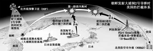 此外,韓國(guó)軍方預(yù)測(cè),朝鮮如果發(fā)射能夠威脅美國(guó)本土的大浦洞2號(hào)改良型導(dǎo)彈,美國(guó)將分兩個(gè)階段予以攔截。大浦洞2號(hào)導(dǎo)彈發(fā)射后,朝鮮半島上空的美國(guó)紅外線預(yù)警衛(wèi)星(DSP)將首先發(fā)現(xiàn)情況。導(dǎo)彈尾部的火焰在太空中也能得到確認(rèn)。預(yù)警衛(wèi)星將向美國(guó)的所有導(dǎo)彈防御體系發(fā)送警報(bào)。導(dǎo)彈升空后,第一階段的攔截體系開(kāi)始運(yùn)作。位于東海的美國(guó)海軍宙斯盾艦將通過(guò)相控陣?yán)走_(dá)實(shí)時(shí)預(yù)測(cè)導(dǎo)彈的軌跡。如果大浦洞2號(hào)導(dǎo)彈接近日本列島,宙斯盾艦將發(fā)射SM-3導(dǎo)彈進(jìn)行攔截。美國(guó)第7艦隊(duì)擁有夏洛號(hào)巡洋艦(CG-67)和斯特塞姆號(hào)驅(qū)逐艦(DDG-63)等九艘宙斯盾艦,一次可以發(fā)射多枚SM-3導(dǎo)彈。盡管日本海上自衛(wèi)隊(duì)的宙斯盾艦上也裝備有SM-3導(dǎo)彈,但是由于日本的和平憲法禁止自衛(wèi)隊(duì)在日本境外使用武器,所以在攔截導(dǎo)彈問(wèn)題上受到了限制。