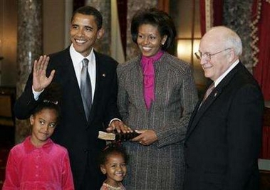 美國副總統(tǒng)切尼與參議員奧巴馬在一起。切尼的夫人稱這兩人是遠(yuǎn)親。(2005年資料圖片)
