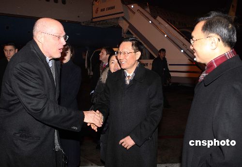 中國財政部長謝旭人(右二)、外交部長楊潔篪(右一)前往北京首都國際機場迎接美國財政部長保爾森。中新社發 毛建軍 攝