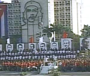 哈瓦那人山人海,廣場上可以看到馬克思、恩格斯和列寧的肖像,還有當年古巴游擊隊領(lǐng)導(dǎo)人切·格瓦拉的大幅圖像。