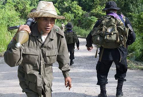 柬埔寨一名士兵攜帶一個火箭發射器與泰國的士兵擦身而過。