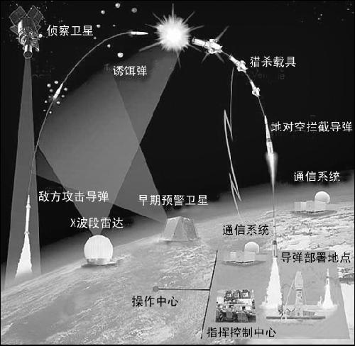 根據對來襲導彈進行攔截的時機不同,彈道導彈防御系統通常可被劃為三大類。“助推段”防御系統是指在助推階段對來襲導彈進行攔截,一般在導彈發射后、尚未投放彈頭的數分鐘內進行攔截。“末段”防御系統是指在彈道飛行最后階段,即在來襲導彈再進入大氣層并即將擊中目標時,對來襲導彈進行攔截。“中段”防御系統的攔截范圍是以上兩者之間的廣大區域,旨在對脫離導彈彈體后尚未再入大氣層、處于太空真空飛行狀態的來襲彈頭進行攔截。從美軍建設導彈防御的進程來看,目前,美軍已經具備了對“中段”和“末段”的初步攔截能力。“中段”攔截武器以美軍部署在太平洋上的“宙斯盾”級導彈驅逐艦和巡洋艦以及部署在阿拉斯加格里利堡的陸基中層攔截導彈為主,“末段”攔截武器以部署在美國境內的“愛國者-3”型導彈為主。
