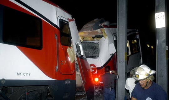 據(jù)來自墨西哥城的消息,今天凌晨在墨西哥城郊區(qū)兩列火車相撞,至少造成80人受傷,有16人被壓在撞擊后火車殘?bào)w中,在當(dāng)?shù)卦斐苫靵y。這是官方宣布的。
