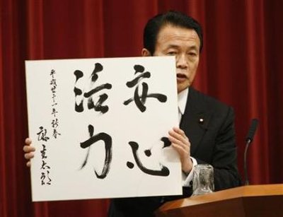 中新網(wǎng)1月6日電 據(jù)星島環(huán)球網(wǎng)報道,日本首相麻生太郎4日用了39秒鐘時間寫下了“安心活力”四個字作為自己新年的執(zhí)政目標(biāo),并于記者會上進(jìn)行了公布。然而,這一舉動并沒有獲得國民的掌聲,卻很快引來了輿論的嘲弄,因為不少人認(rèn)為麻生寫的四個字中,至少一個字是錯別字。