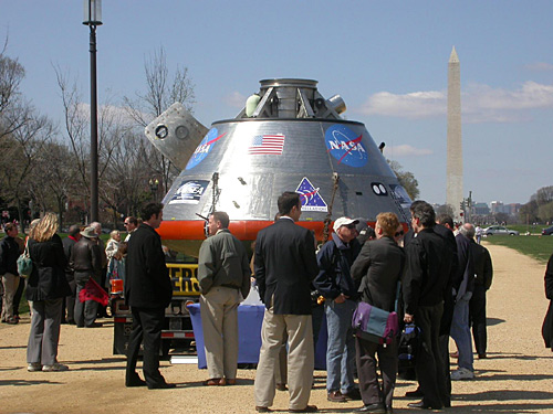據報道,國家航空和航天局30日在美國華盛頓市中心的國家大草坪上展出了實物大小的獵戶座飛船模型。