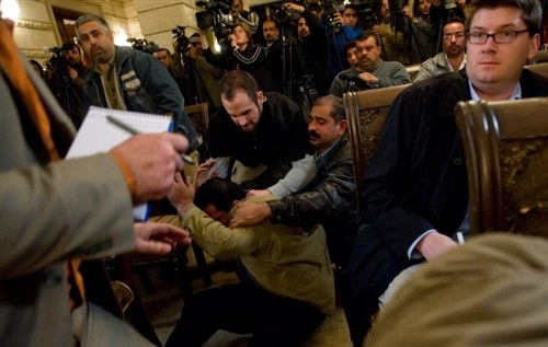 不過,塔拉巴尼的話似乎并不能代表全體伊拉克人民的真實(shí)感受。在與馬利基的聯(lián)合發(fā)布會上,布什講話時,一名伊拉克記者將兩只鞋朝布什扔了過去,并高聲辱罵:“這是伊拉克人民給你的告別之吻!”好在布什身手敏捷,彎腰躲過了襲擊。隨后,馬利基英雄救“美”,用身體擋住了這位美國客人,而那個丟鞋的男子也被保安制服。