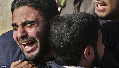 巴勒斯坦人看到親人的尸體后痛哭。